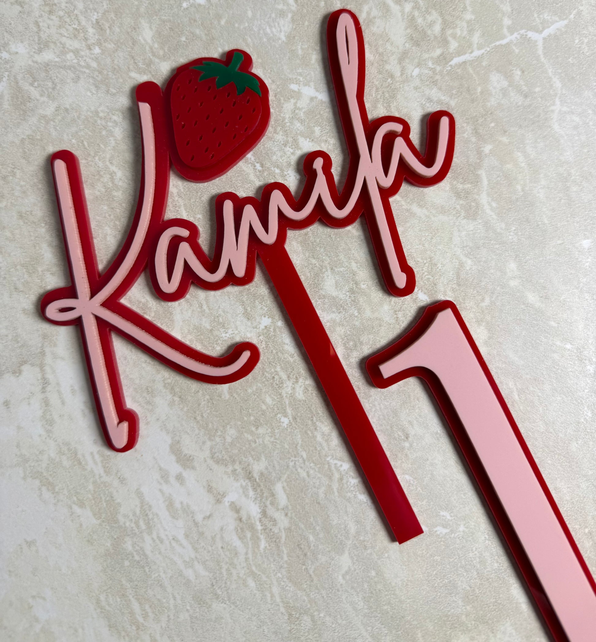 Dieses Modell besticht durch ein elegantes Design mit einem Namen in Schreibschrift und einer entzückenden roten und grünen Erdbeere .