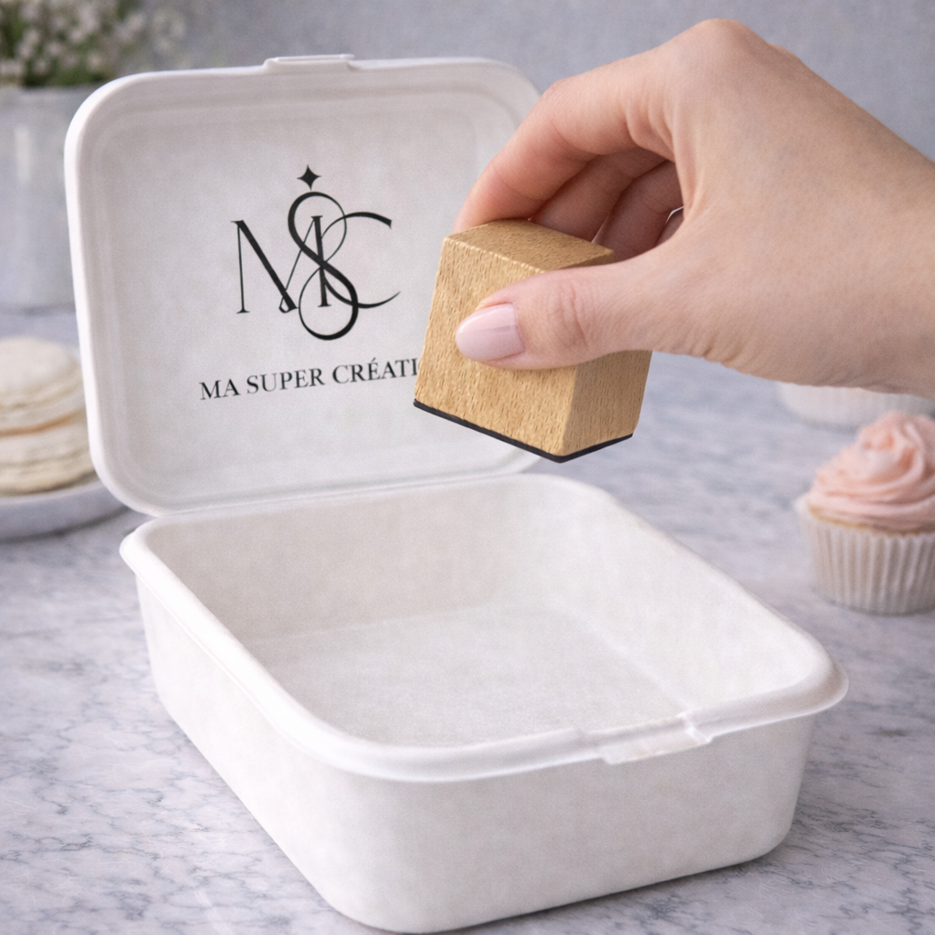 Mettez votre marque en avant avec ce tampon personnalisable de 4x4cm, parfait pour les emballages professionnels comme les cartons, sacs en papier, et autres supports.